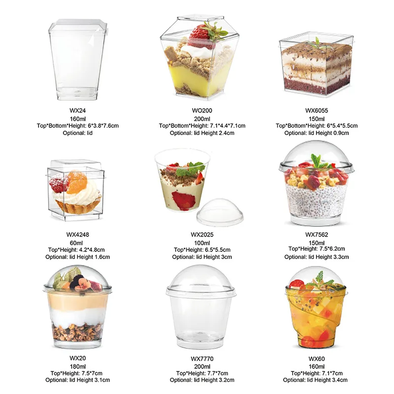 Mode specialformade dessertplastmuggar är trendiga föremål som Ningbo Powerr Plastic Products Co., Ltd har fokuserat på att utveckla de senaste åren. De är gjorda av livsmedelssäkra plastmaterial. Och de har ingen lukt, tål höga temperaturer och deformeras inte lätt. Våra dessertmuggar av plast innehåller olika stilar som runda, fyrkantiga, slitsade och andra kreativa mönster. De kan användas till olika desserter och lättare mat såsom kakor, mousse, pudding, yoghurt, fruktsmoothies, glass, etc.